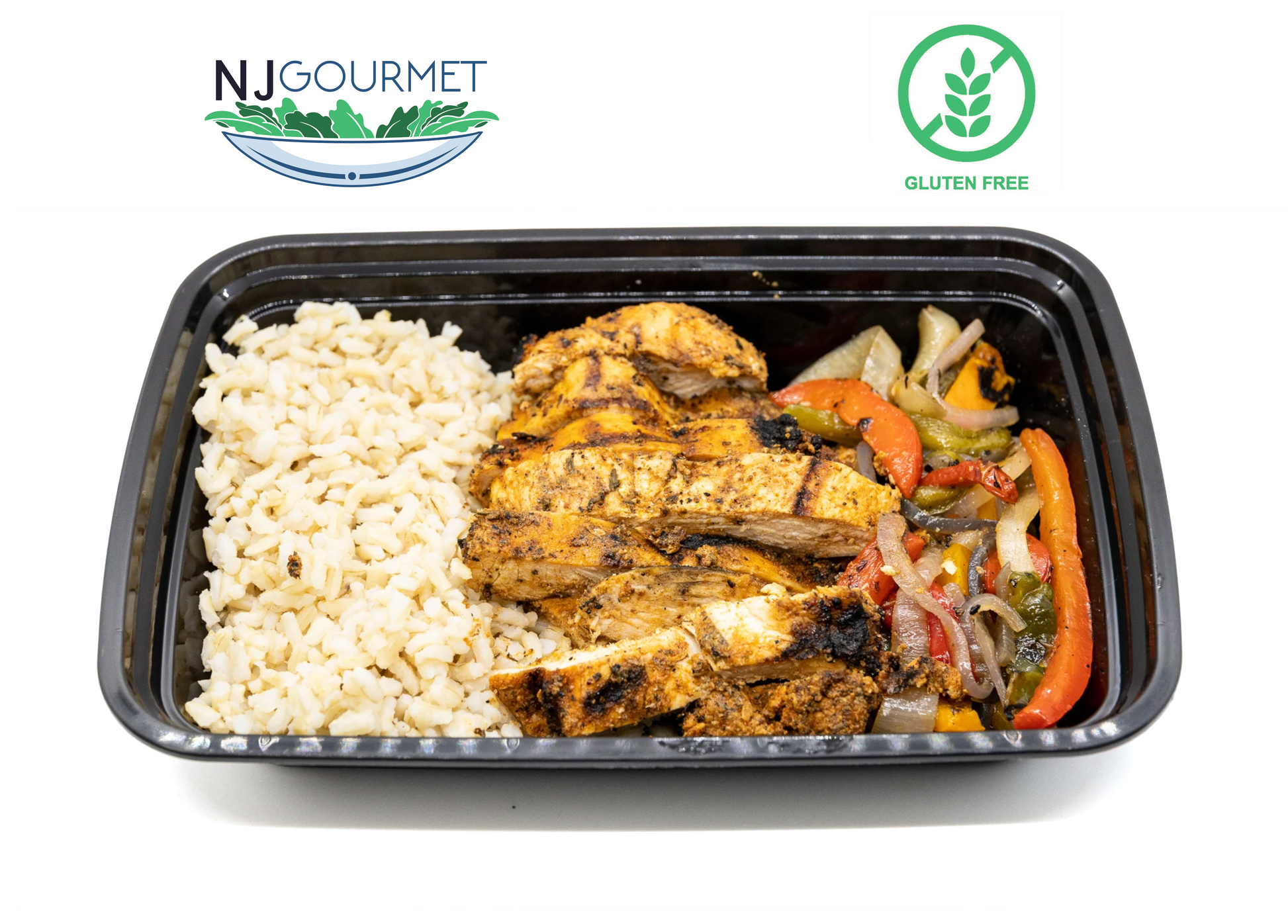 Grilled blackened chicken breast. This spicy and tender meat is served with fluffy brown rice, sautéed onions and sweet bell peppers.
